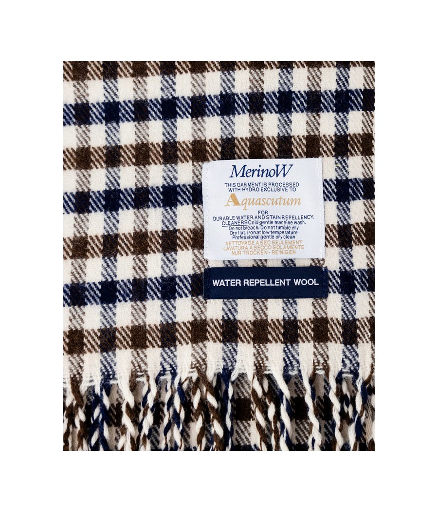Sciarpa in tessuto 100% Merino, smacchinata in Club Check, trattata con una leggera resinatura a spray per creare la caratteristica di articolo repellente all''''acqua. Etichetta tessuto posizionata sul lato interno.