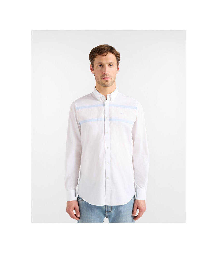 Camicia da uomo in tessuto cotone piquet natural stretch modello regular fit, la vestibilità ideale per non costringere i movimenti, è rifinito dall'iconico bassotto Blaine, simbolo del brand, ricamato a contrasto sul petto.