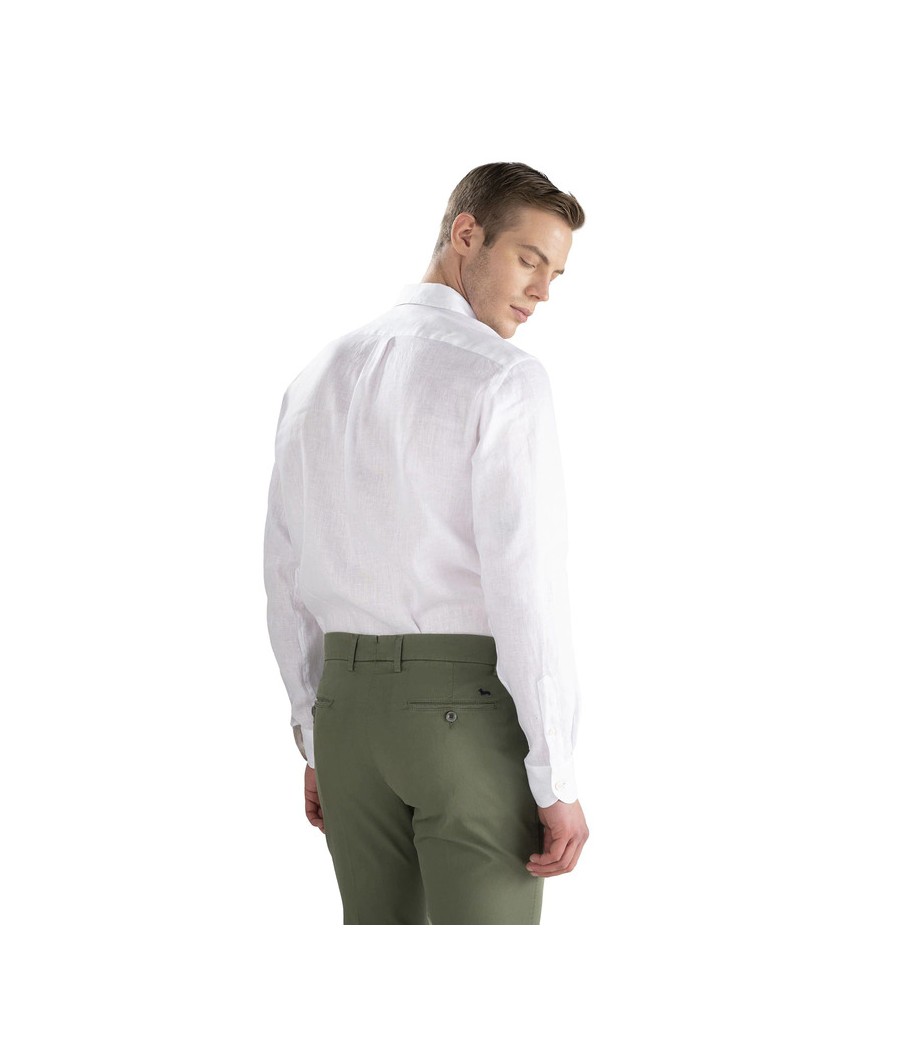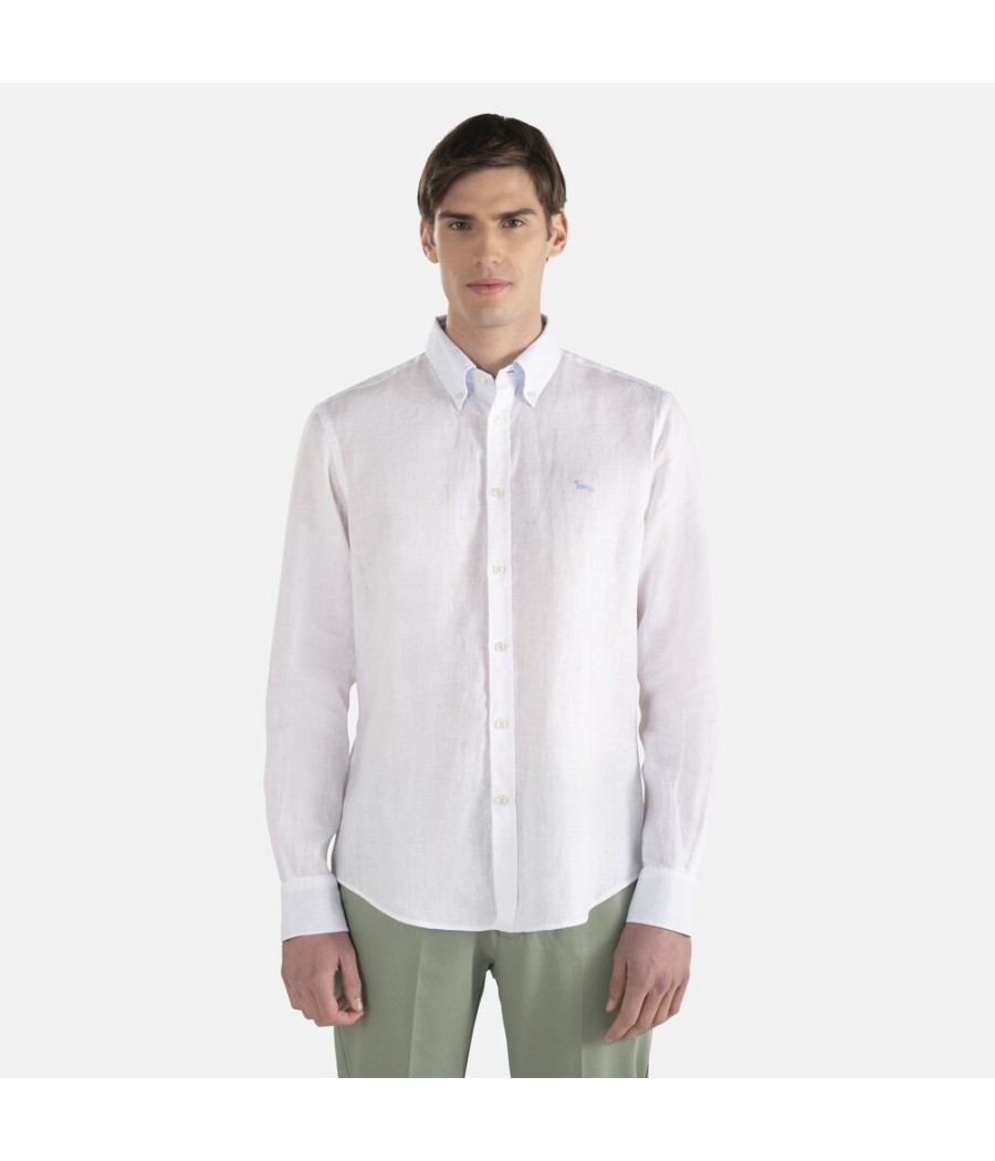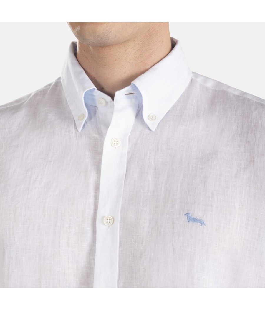 Elegante e raffinata, questa camicia da uomo in 100% lino presenta un colletto button-down ed è impreziosita da tessuto a contrasto all'interno dei polsi e del sotto collo. Perfetta per ogni occasione, viene proposta da Harmont & Blaine con una morbida vestibilità regular.Camicia Realizzata in puro lino. Collo button down e Bassotto ricamato a contrasto sul lato cuore.