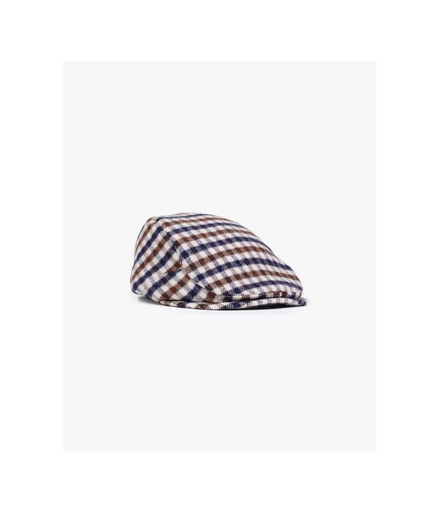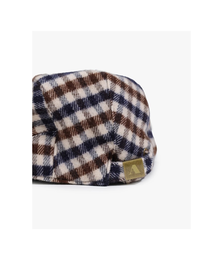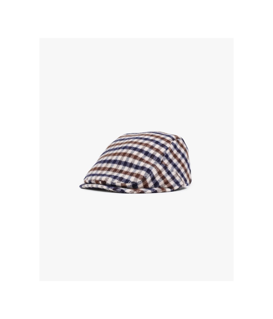 coppola in tessuto 100% Merino, smacchinata in Club Check, trattata con una leggera resinatura a spray per creare la caratteristica di articolo repellente all'acqua. Etichetta tessuto posizionata sul lato interno.