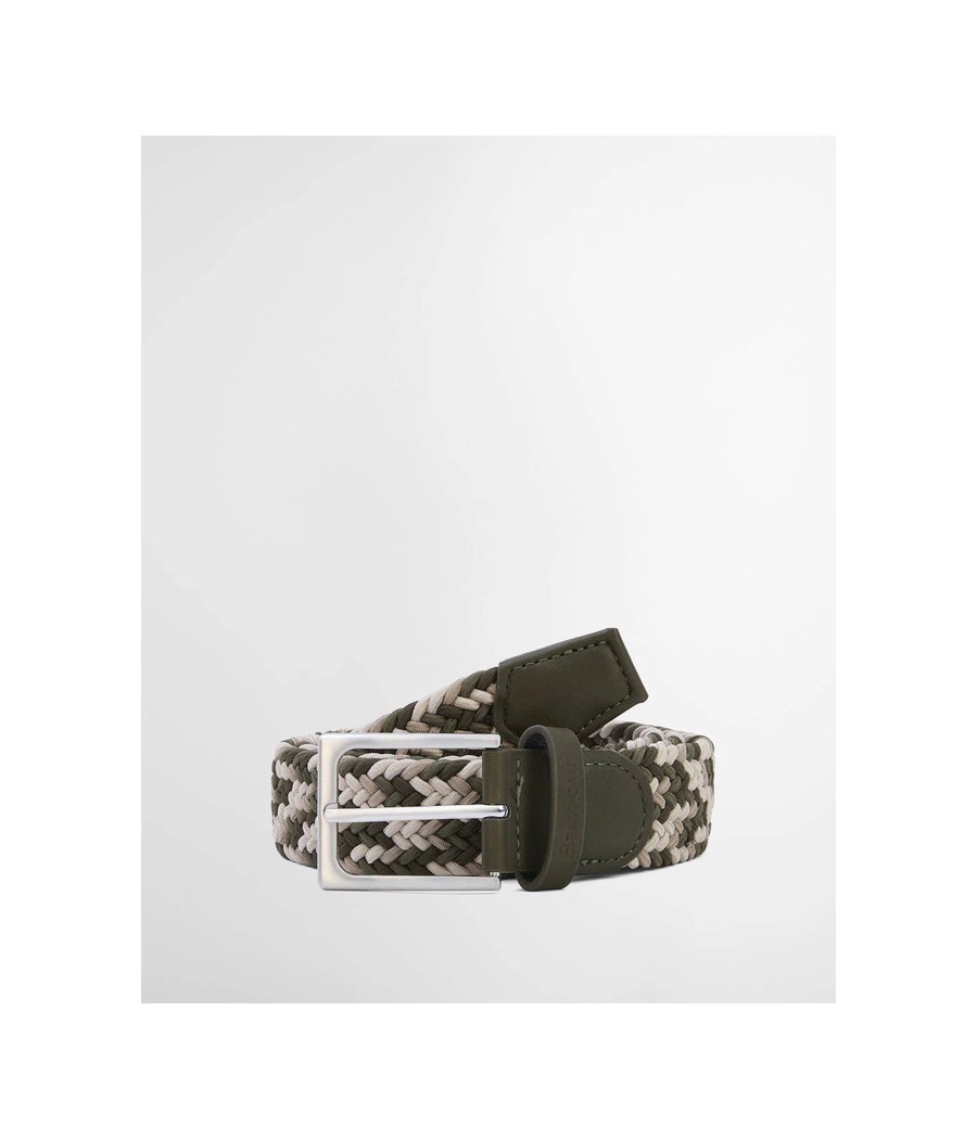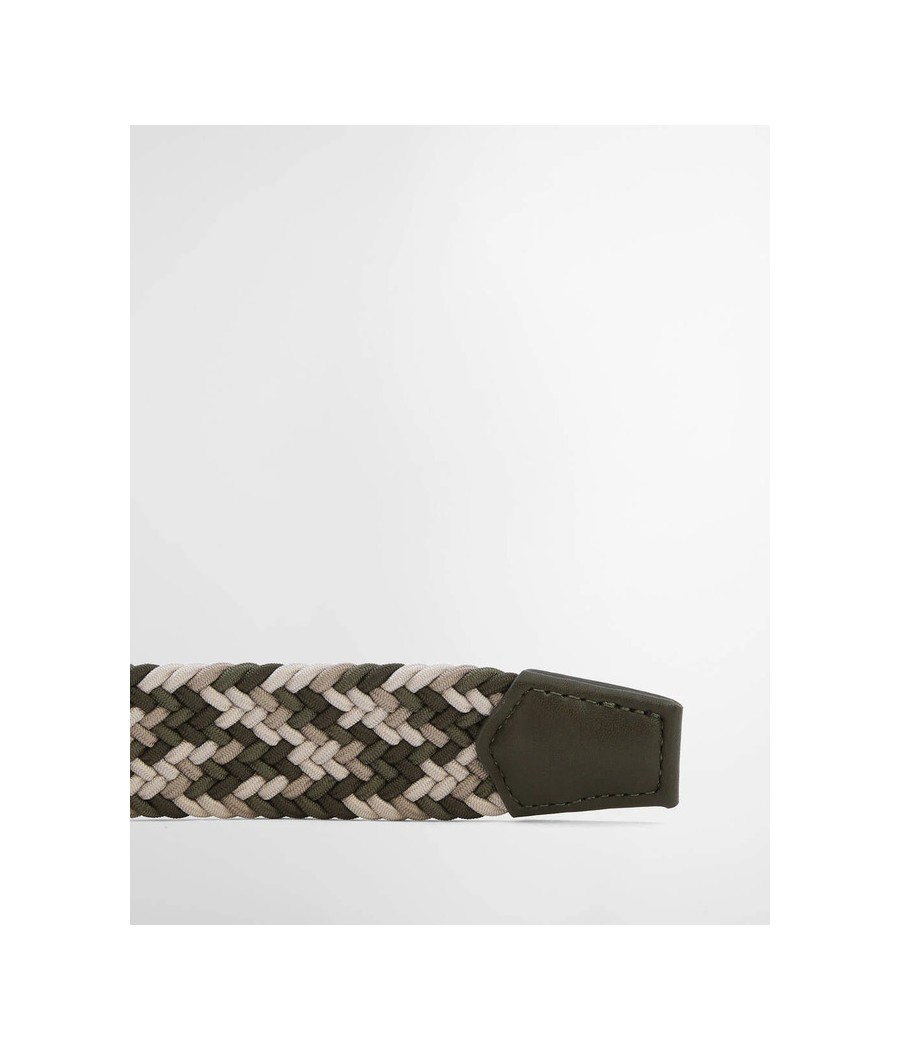 La cintura Barbour Ford è un modello multicolore realizzato in tessuto elasticizzato e rifinito in vera pelle. È rifinito con una fibbia ad ardiglione in metallo effetto ottone invecchiato e un logo in rilievo sul passante.