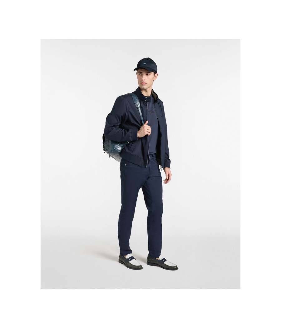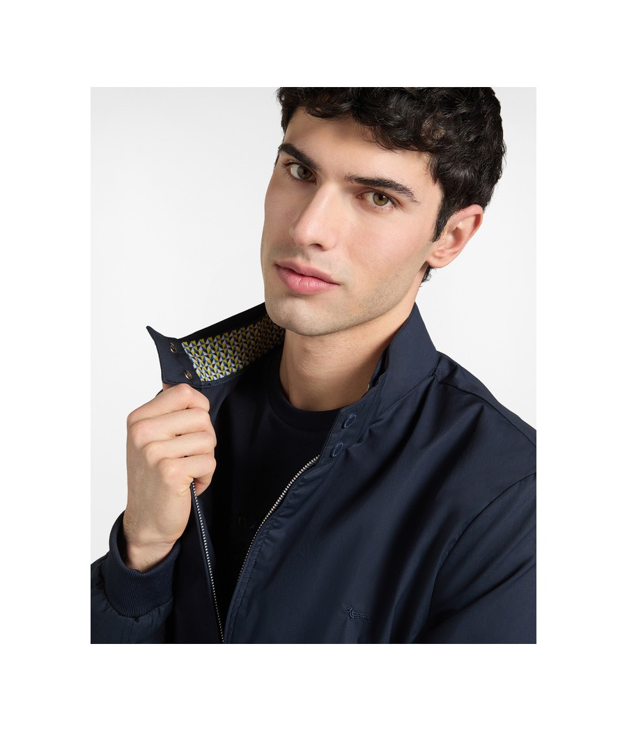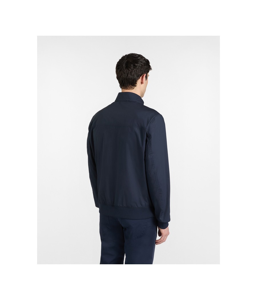 Giubbino leggero in puro cotone con finitura paper touch, caratterizzato da una mano asciutta Chiusura con zip doppio cursore, collo in piedi con bottoncini e tasche sui fianchi. Interno sfoderato con due pratiche tasche.