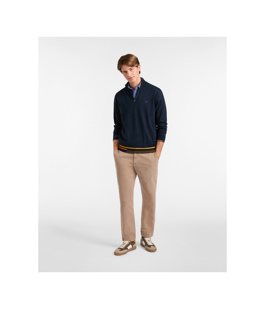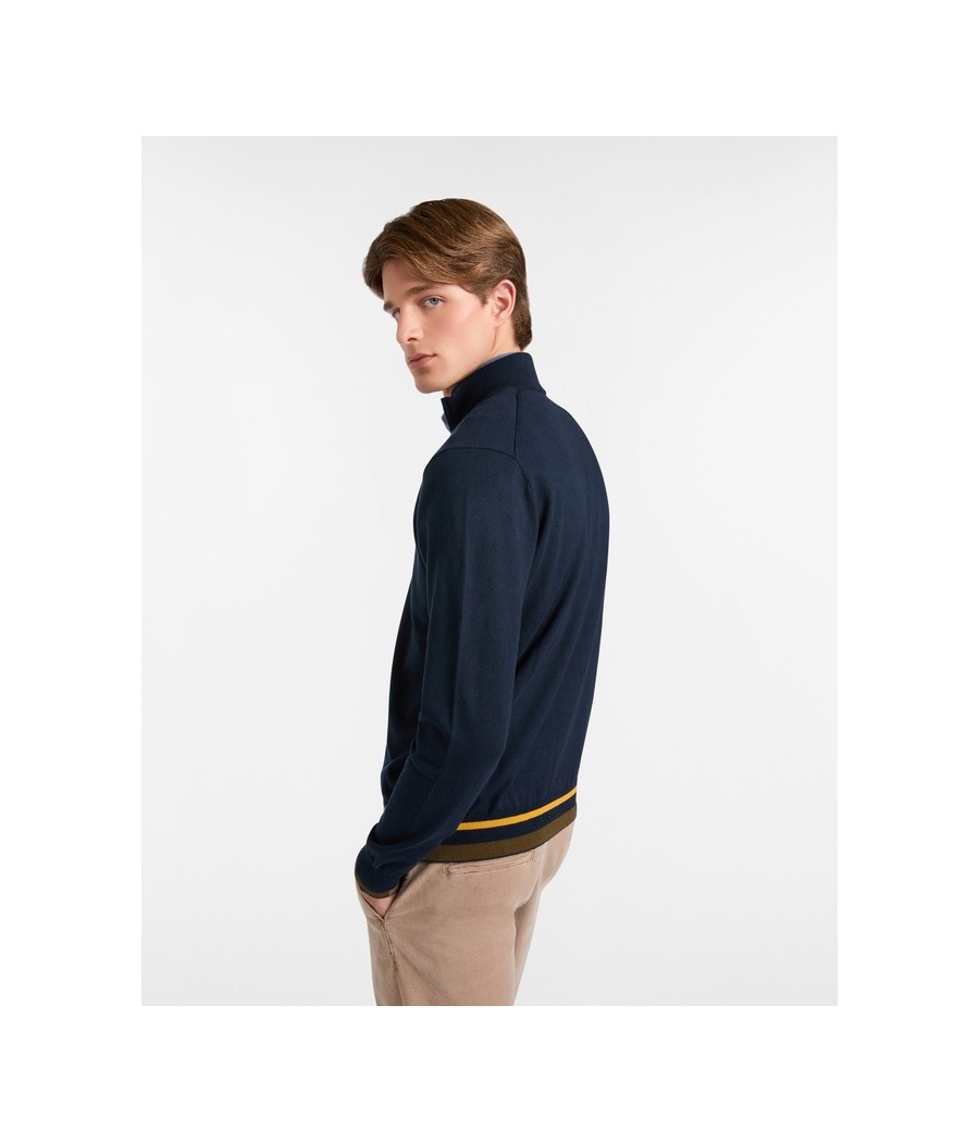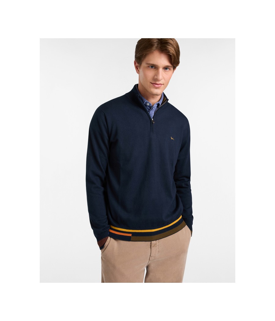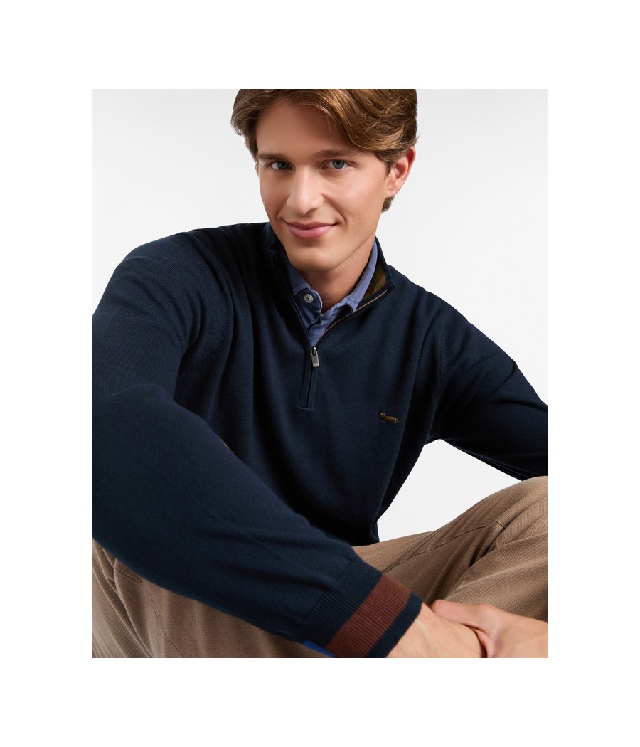 Pullover half zip realizzato in misto cotone e lana è un capo dall'appeal vagamente sportivo, perfetto per le occasioni più casual. Il design lineare è animato da allegri blocchi di colore in corrispondenza dei polsi, del fondo e del collo in piedi con cerniera e interno a contrasto. Ad assicurare massimo comfort a questo pullover dalla versatile vestibilità regular troviamo la lavorazione a costine sempre su fondo capo, collo e polsi, mentre sul petto non può mancare l'emblematico bassotto Blaine ricamato a contrasto.