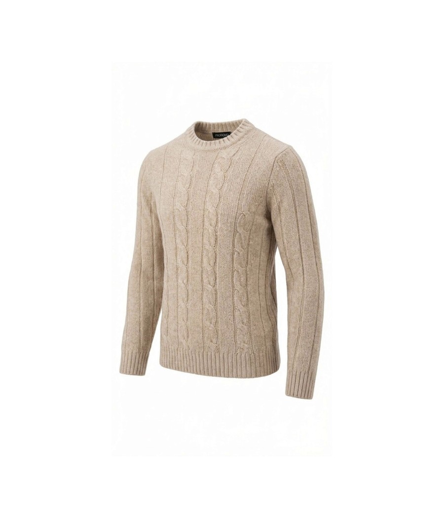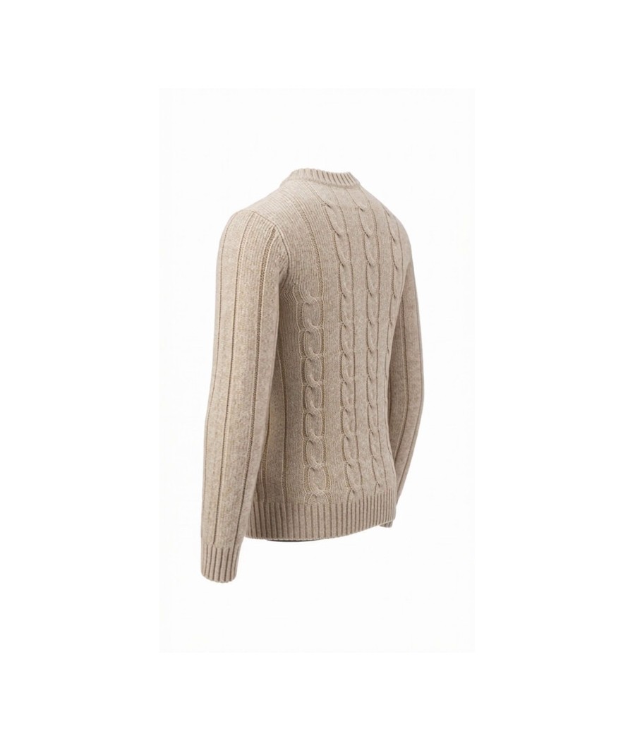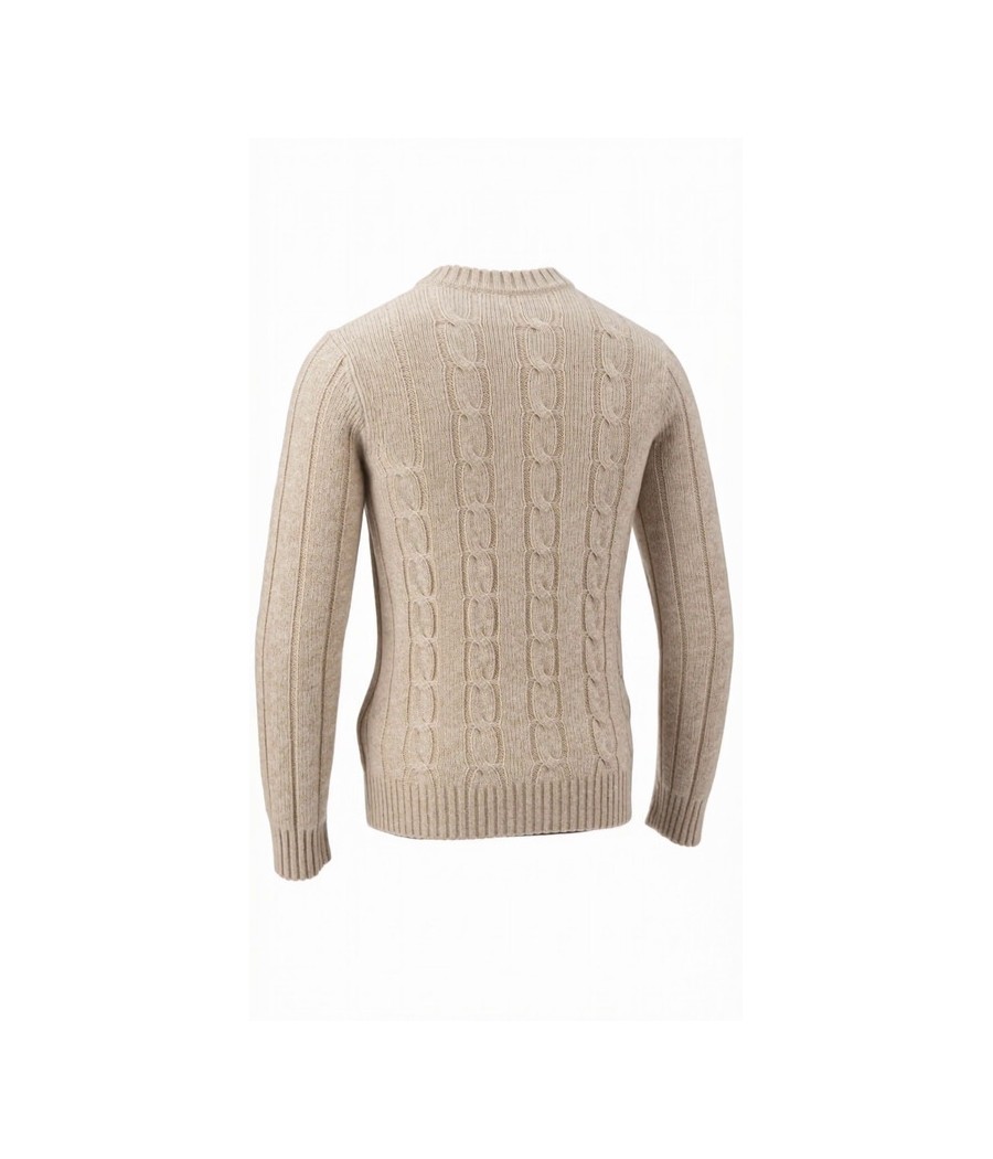 Maglione girocollo in pura lana Shetland operata, impreziosito da una particolare lavorazione Aran sul davanti. La lana Shetland, naturalmente calda e resistente, offre un perfetto equilibrio tra comfort e leggerezza, garantendo al capo un’elevata durata nel tempo e un tocco autentico. La texture leggermente materica esalta il carattere heritage-contemporaneo del design. Fondo, collo e polsini a coste valorizzano la vestibilità e ne sottolineano il design essenziale.