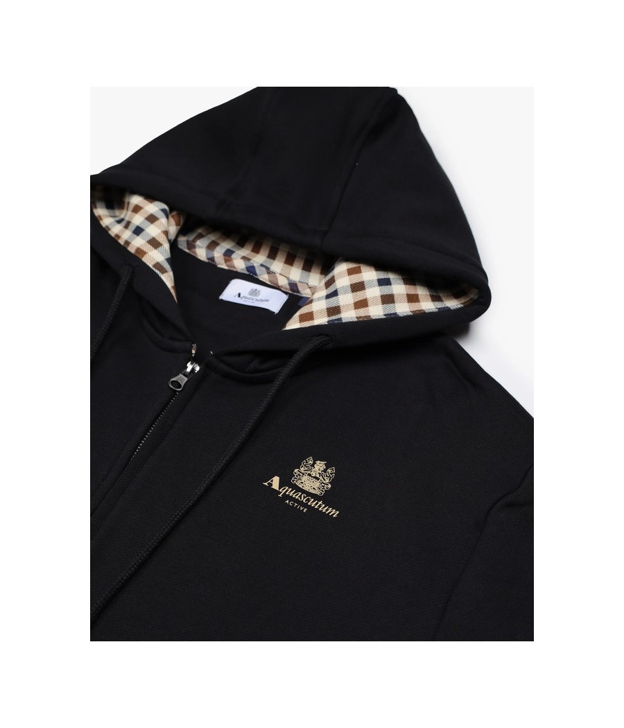 Un capo iconico del guardaroba Aquascutum Active. Questa felpa full zip è realizzata in cotone compatto non garzato per garantire comfort strutturato. Il cappuccio è foderato in popeline di cotone con l’inconfondibile motivo Club Check, mentre sul petto è stampato il logo Aquascutum Active accompagnato dallo storico Crest. Completano il capo una zip YKK a doppio cursore e finiture in costina tono su tono.