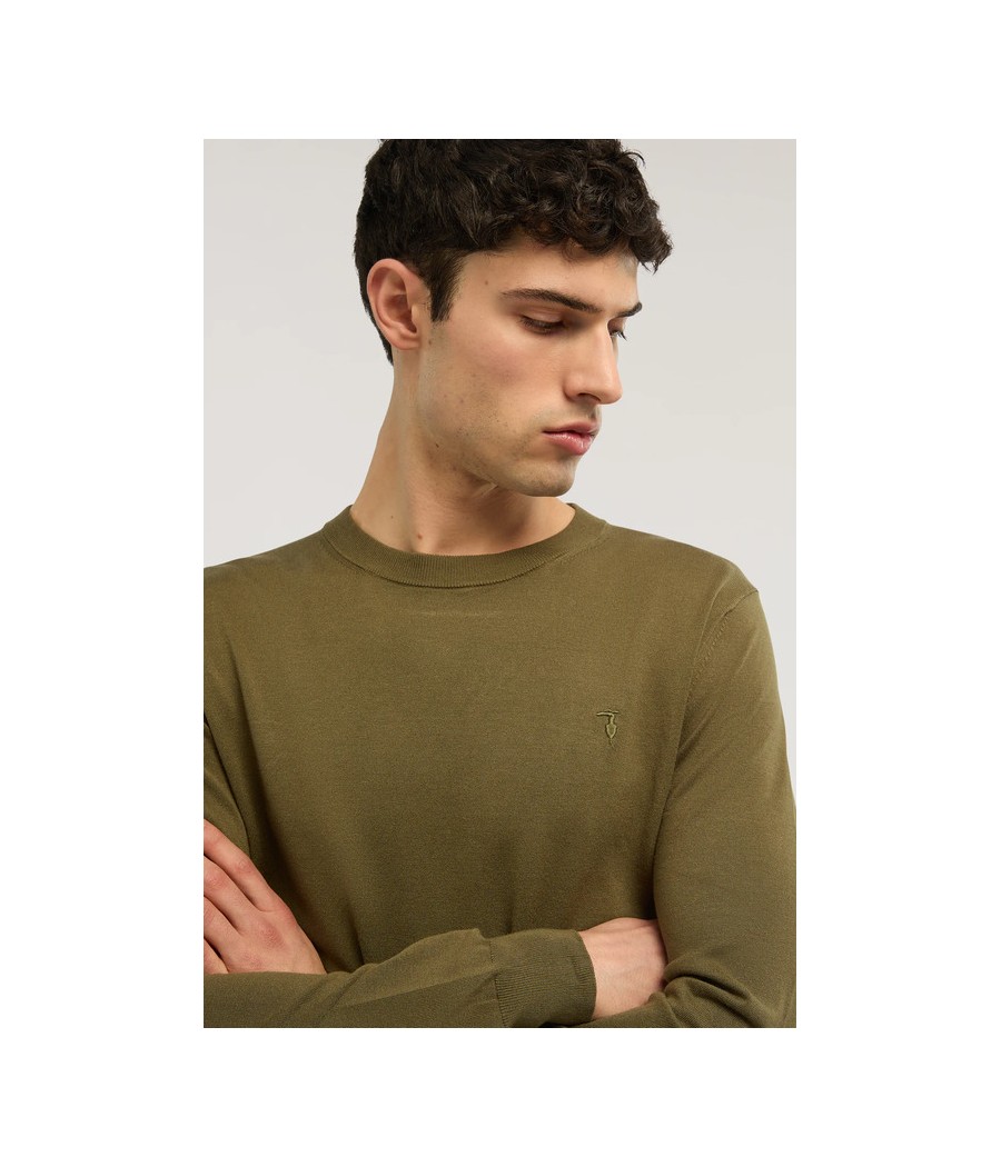 Essenziale e raffinata, la maglia girocollo in viscosa rappresenta l'equilibrio perfetto tra comfort e stile. La finezza 14 della lavorazione rasata garantisce una texture morbida e piacevole al tatto, mentre il fit slim valorizza la silhouette maschile con eleganza discreta. Il ricamo levriero al punto cuore aggiunge quel dettaglio distintivo che caratterizza ogni capo Trussardi. Perfetta per un look smart casual, si abbina facilmente a jeans per il tempo libero o a pantaloni sartoriali per occasioni più formali.