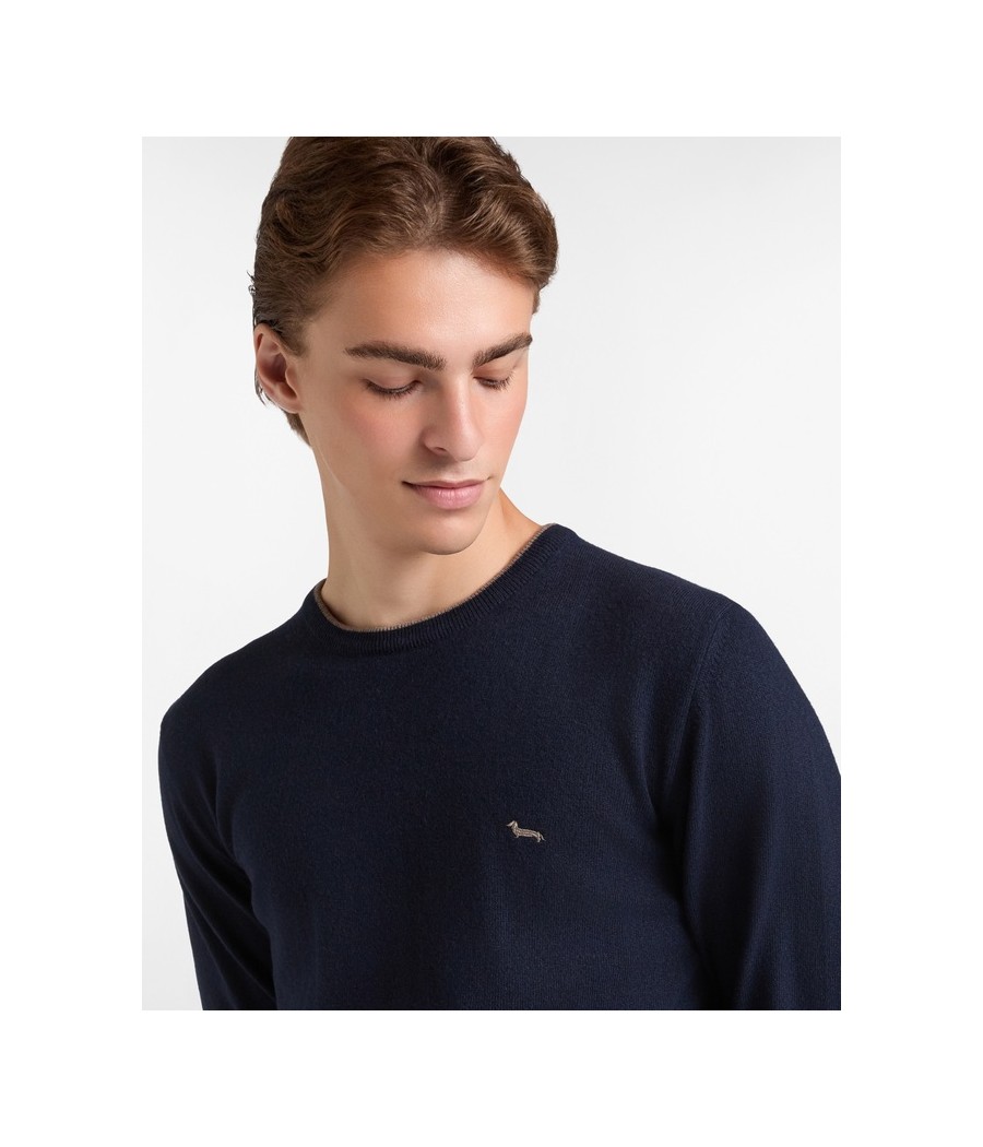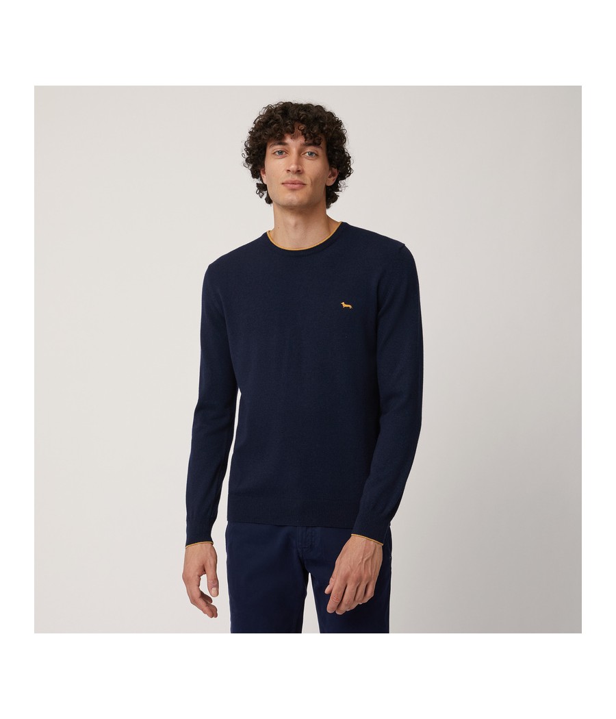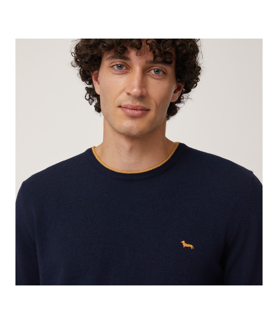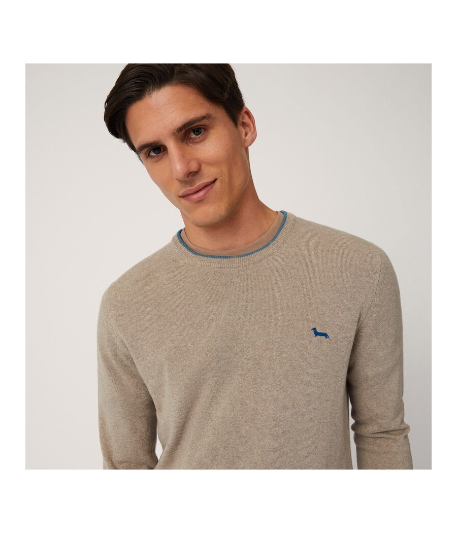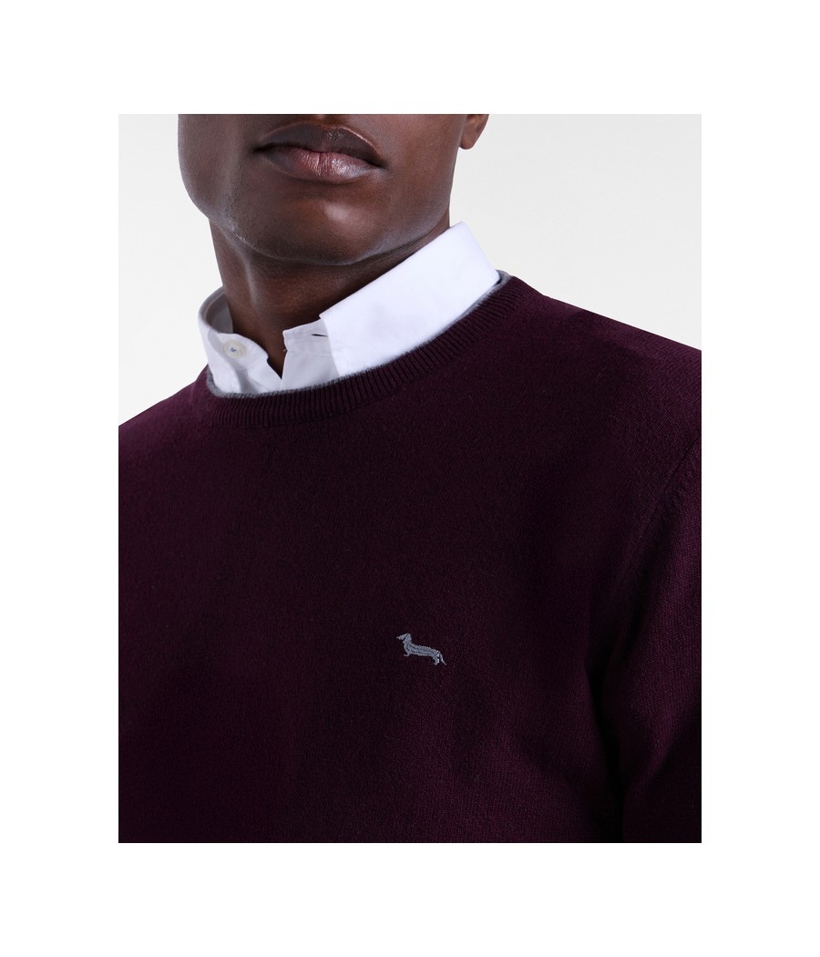 Pullover basic realizzato in misto cashmere tinta unita con sottile riga a contrasto lungo il girocollo. Bassotto ricamato sul lato cuore.