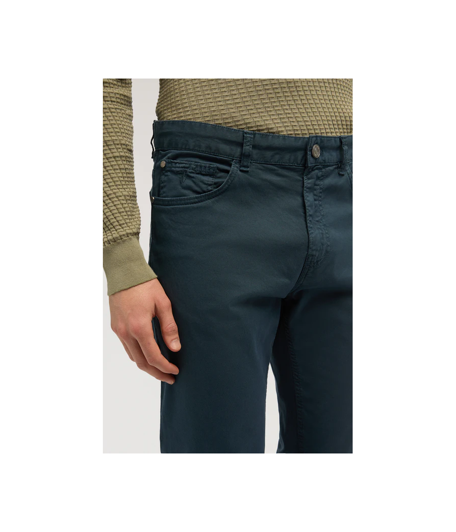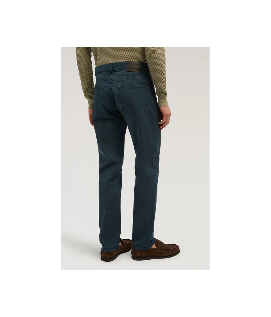 Pantalone 5 tasche 370 slim fit in gabardina leggera con salpa in pelle, 3% elastan e fodera interna in cotone.
