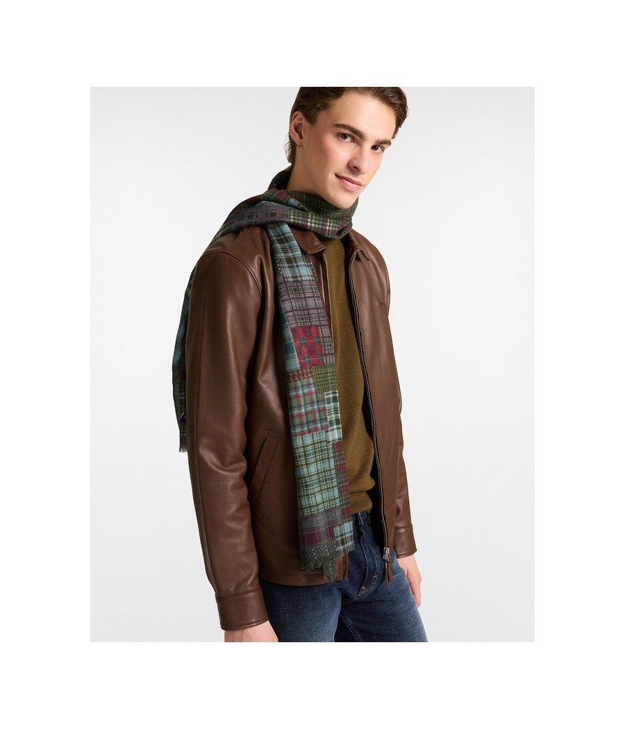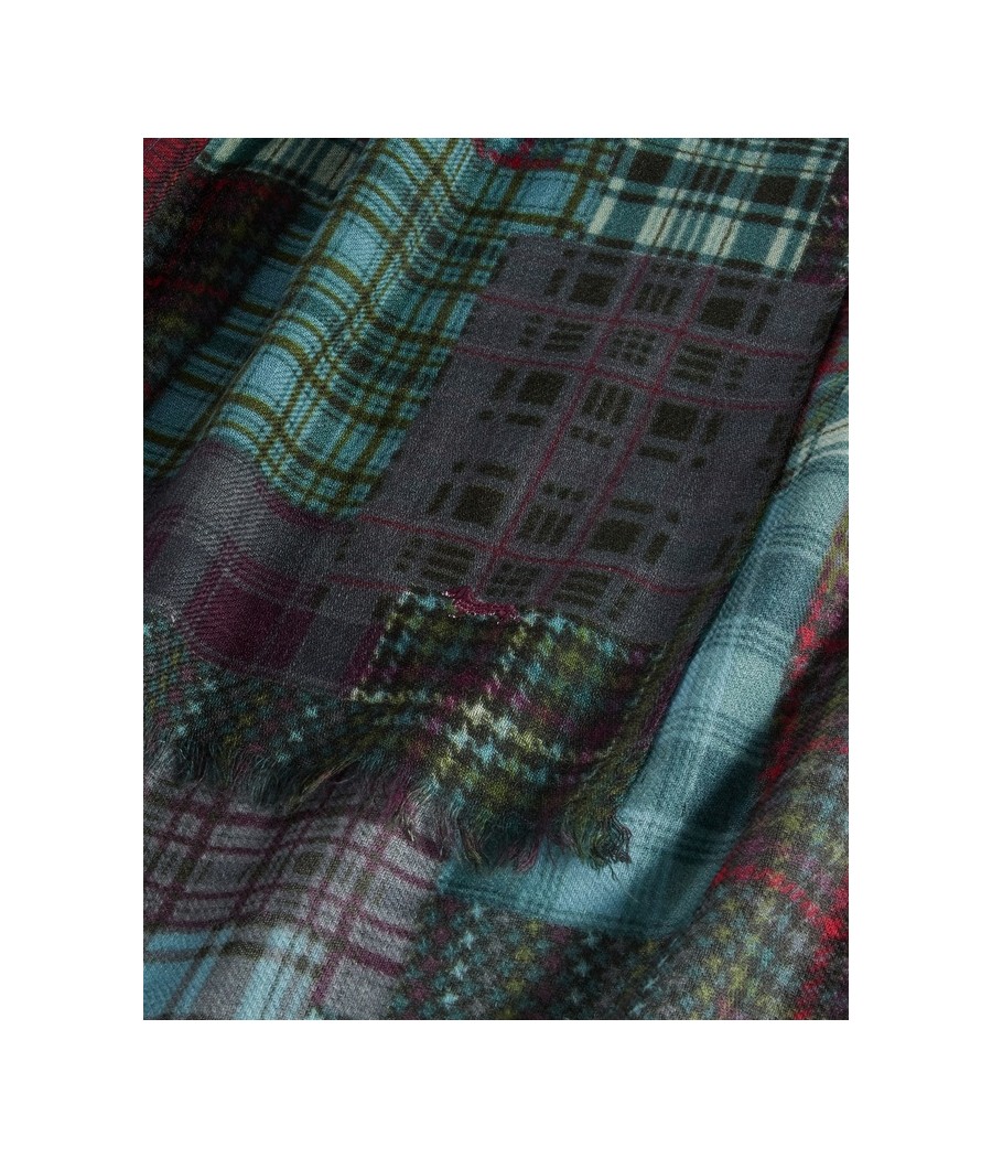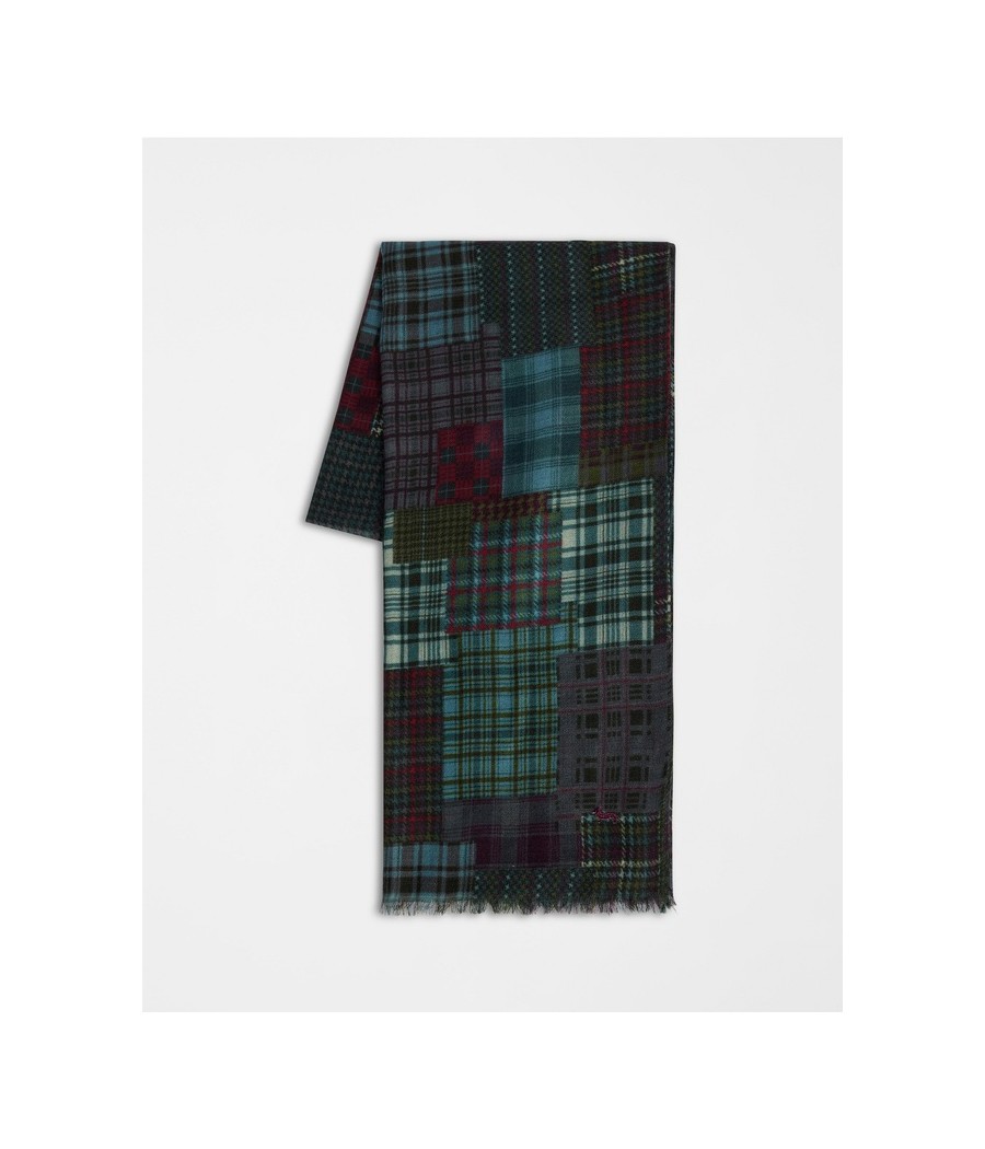 Versatile e ricca di carattere, questa sciarpa in 100% lana presenta una vivace stampa patchwork che unisce diverse fantasie check e tartan nei toni del rosso, blu, verde e grigio. Il design originale dona un tocco distintivo ai look invernali, mentre il tessuto in pura lana garantisce calore e morbidezza al tatto. Rifinita con frange corte su entrambi i lati, è l’accessorio perfetto per completare outfit casual o smart con un’eleganza rilassata e contemporanea.